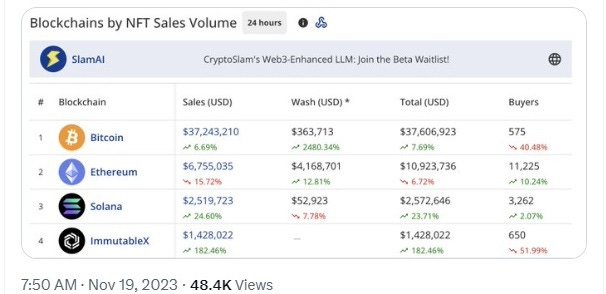 11月はビットコインのNFT分野、特にOrdinalsまたはInscriptionsが人気トレンドとして浮上しています。これらのNFT(画像、動画、ゲームなどのデータファイル)はビットコインのブロックチェーン内に保存されます。