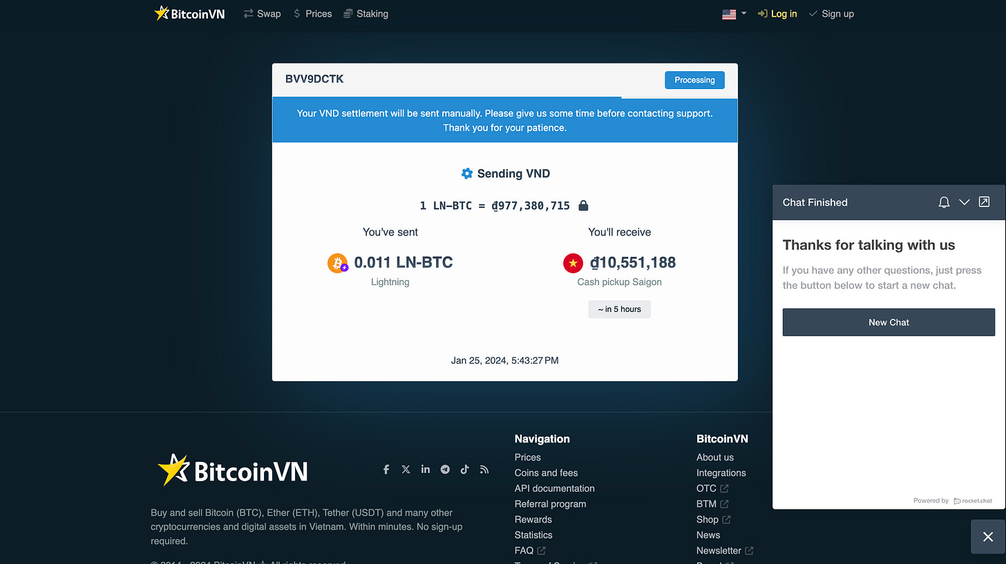 仮に支払いが完了したけどチャットボックスから連絡がなかったりした場合は、直接サポートのメールに連絡を取ったりすれば何かしらの方法で後ほど連絡を返してくれると思います。ベトナムなのでここらへんは割と適当ですが、スキャムとかではないので多少の時間差は目を瞑りましょう。(ちなみに自分も現金の受取自体はライトニング送金をした翌日になりました)