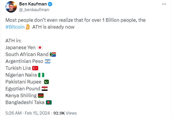 以前にニュースレターに書きましたが、読者の皆さんは日本円でのビットコイン過去最高値(ATH)達成が他の国と比べて早かったことを覚えてますか?日本で2月14日にATHを付けたとき、米ドルではまだ $53,000にも達していませんでした。早くビットコインのATHに到達する通貨ほど、世界の中では弱い通貨とみなされます。