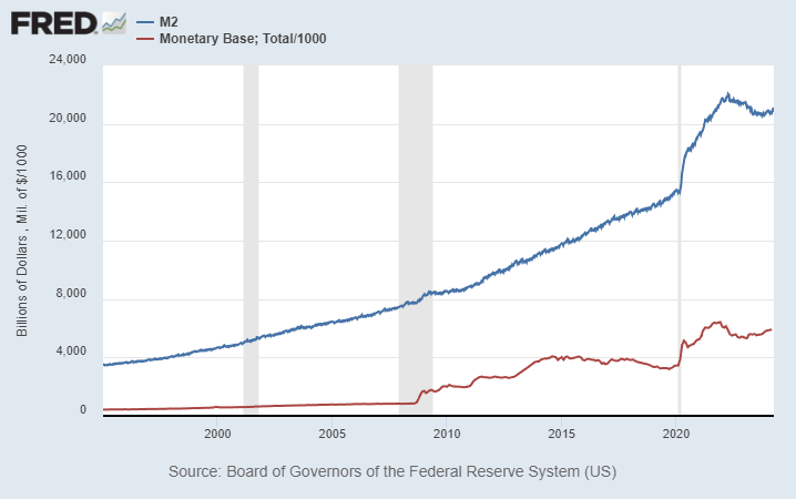 以下のチャートのM2(青線)は米国の「現金通貨+預金通貨+準通貨+譲渡性預金(CD)」の通貨残高合計、マネーストックを示しています。市場に米ドルがどんどん供給され続けており、米ドルも世界の基軸通貨としての信用と価値が失われてきています(出典)。