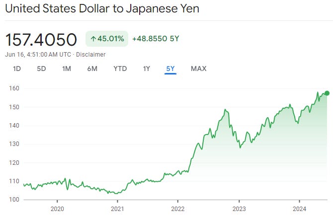 2020年の米ドル対円相場はほぼ110円以下でしたが、6月14日現在は157円になっています。4月下旬には一時160円を超え、円安進行を抑えるために日銀がゴールデンウィーク中に為替介入し、過去最大規模、約9.8兆円分のドル売り円買いが行われました。