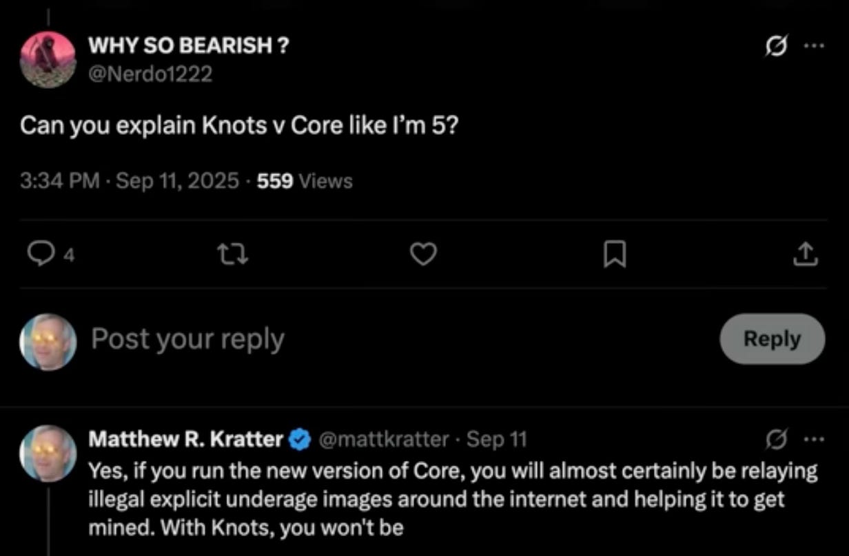 もし新しいCoreを使えば、ほぼ確実に違法な未成年の露骨画像をインターネット上でリレーし、マイニングされる手助けをすることになります。Knotsを使えばそうはなりません。──これが簡潔なまとめです。