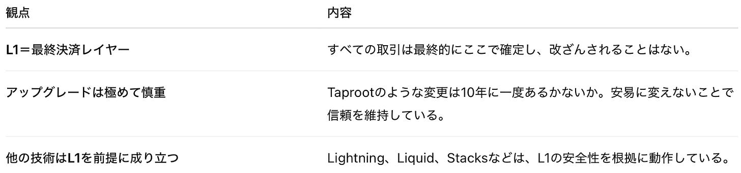 Lightning Network や Liquid、Stacks のような上位技術も、最終的にはこのレイヤーに清算されることで安全性を得ています。