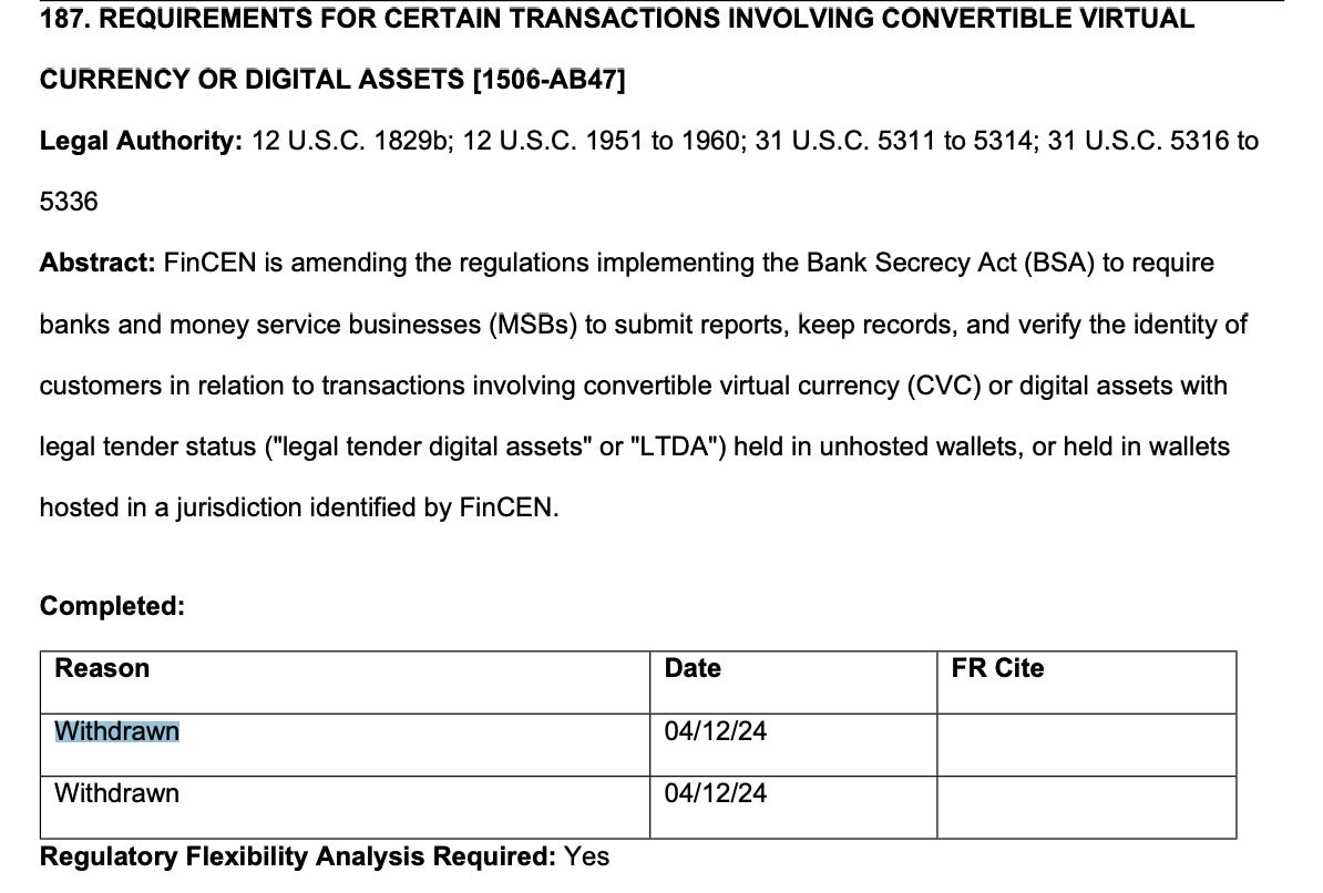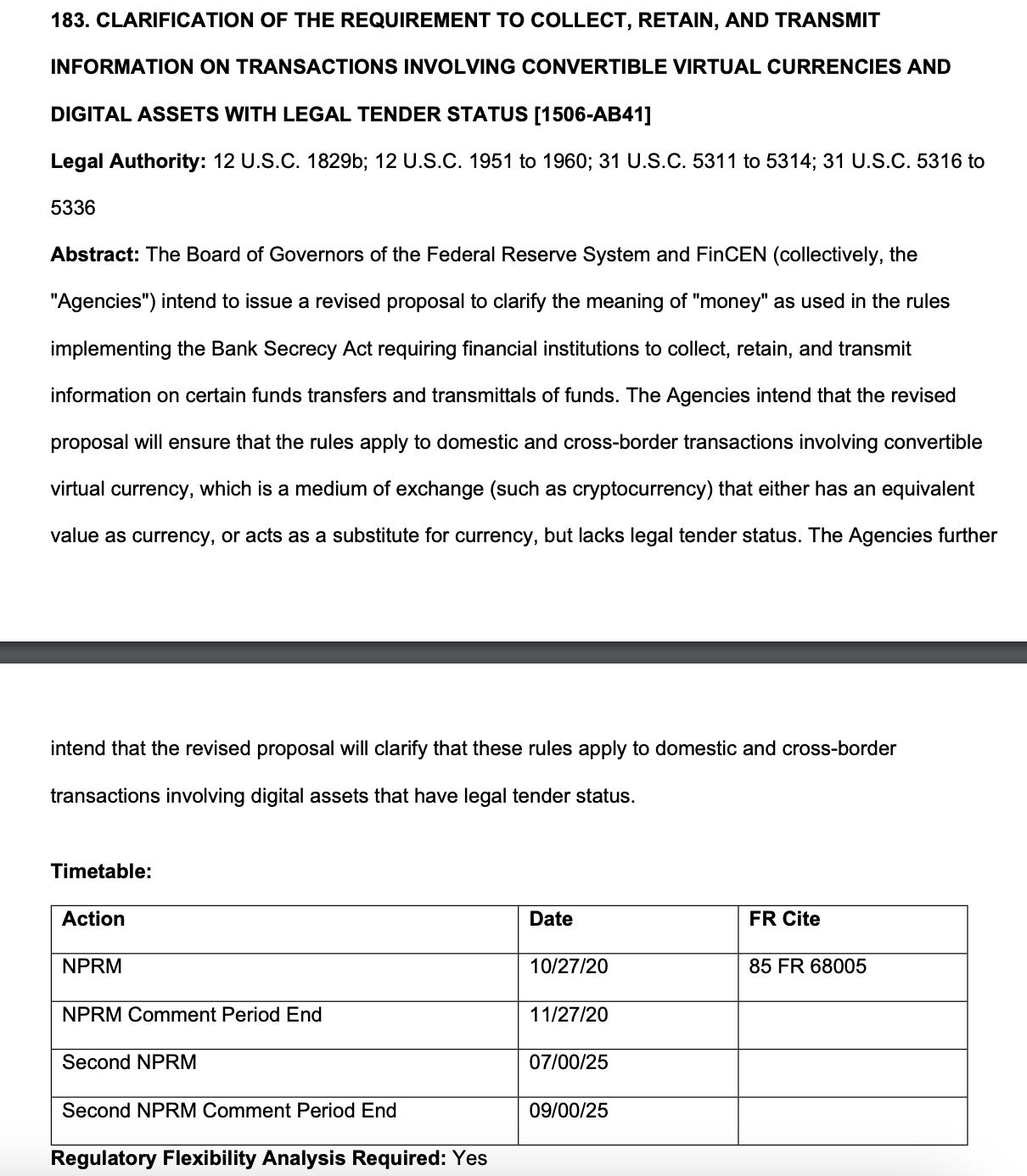これは、FinCENが、銀行秘密法(BSA))実施規則を改正し、銀行および資金サービス事業者(MSB)に対して、「unhostedウォレットに保管されているか、FinCEN が指定した管轄区域でホストされているウォレットに保管されている兌換可能な仮想通貨または法定通貨ステータスを持つデジタル資産が関与する取引に関して、報告書の提出、記録の保持、および顧客の身元確認を義務付ける」としていたもの。