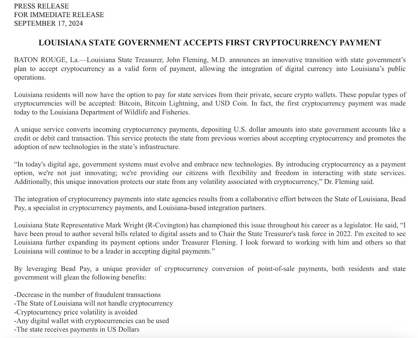 米ルイジアナ州、Bitcoin・Bitcoin LightningおよびUSDCを支払い手段として受け入れる計画を発表(出典:9/17付)