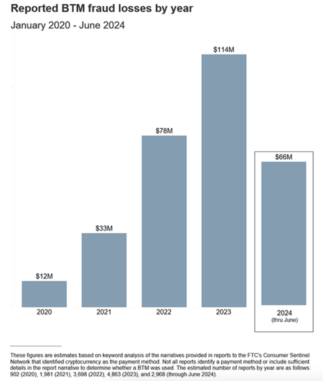 FTC Consumer Sentinel Networkのデータによると、ビットコインATMでの詐欺による損失は、2020年から2023年にかけてほぼ10倍に増加し、2024年上半期だけで$65mを超えています。