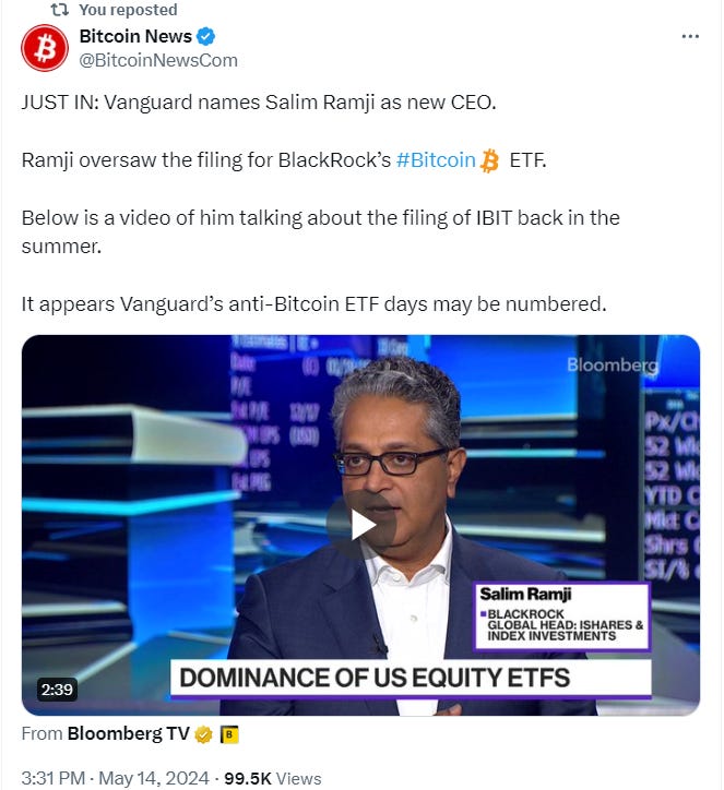 米国時間14日の発表によると、このVanguard新CEOに、BlackRockの幹部役員としてビットコイン現物ETFのファイリングに尽力したSalim Ramji氏が選任されました。ついにVanguardも、ビットコインに積極的に参入することになるのか、今後の動向に注目したいですね。