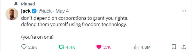 また、Dorsey氏は分散型ソーシャルメディア・プロトコルのNostrの開発を継続的に支持しており、最近もビットコインとNostrのオープンソースプロジェクトに数百万ドルを寄付しました。昨年はNostr優先でXにあまり投稿していませんでしたが、より多くの人々に影響を与えることを重視したのか、Xにも投稿が増えています。