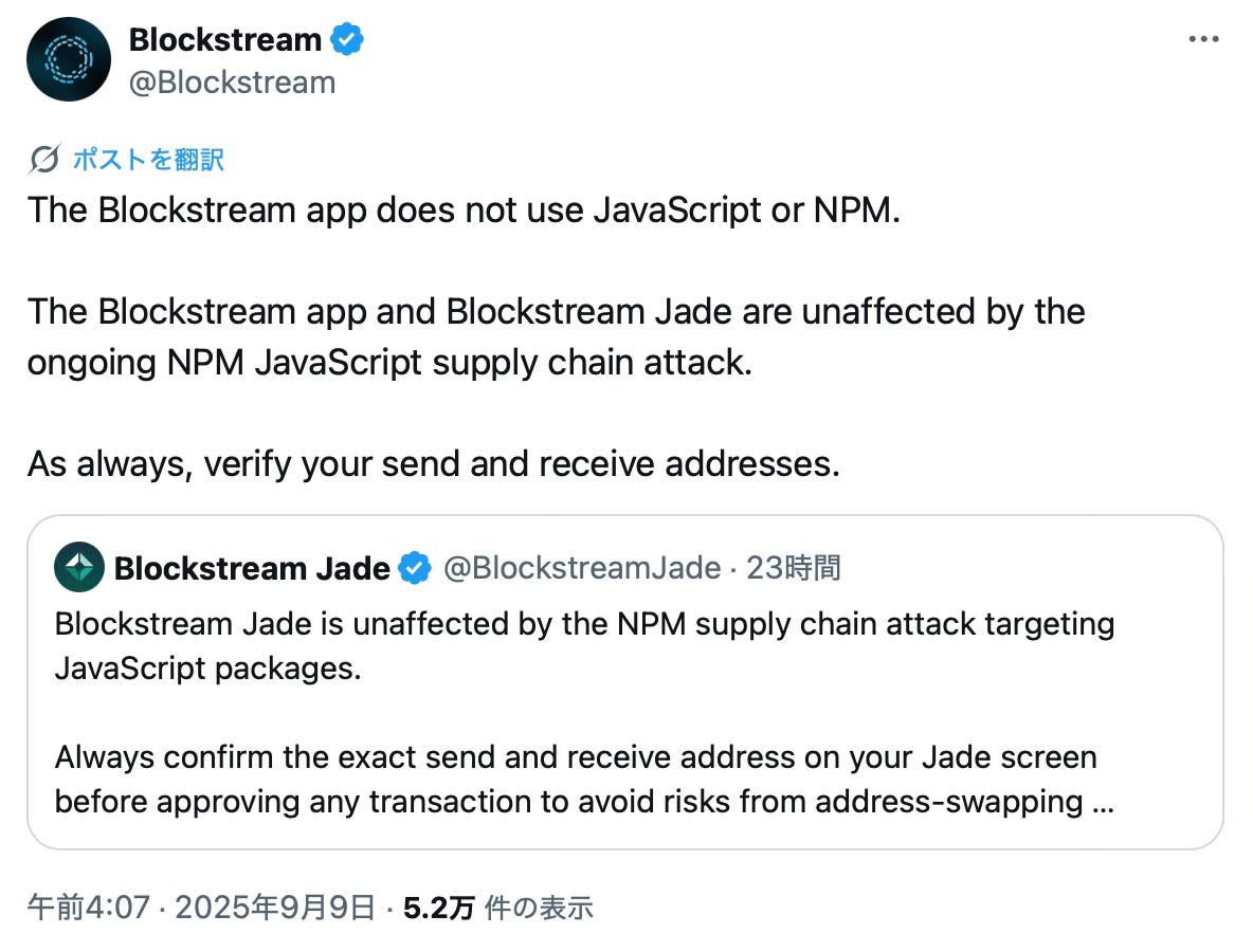 BlockstreamアプリおよびBlockstream Jadeは、現在進行中のNPM JavaScriptサプライチェーン攻撃の影響を受けていません。