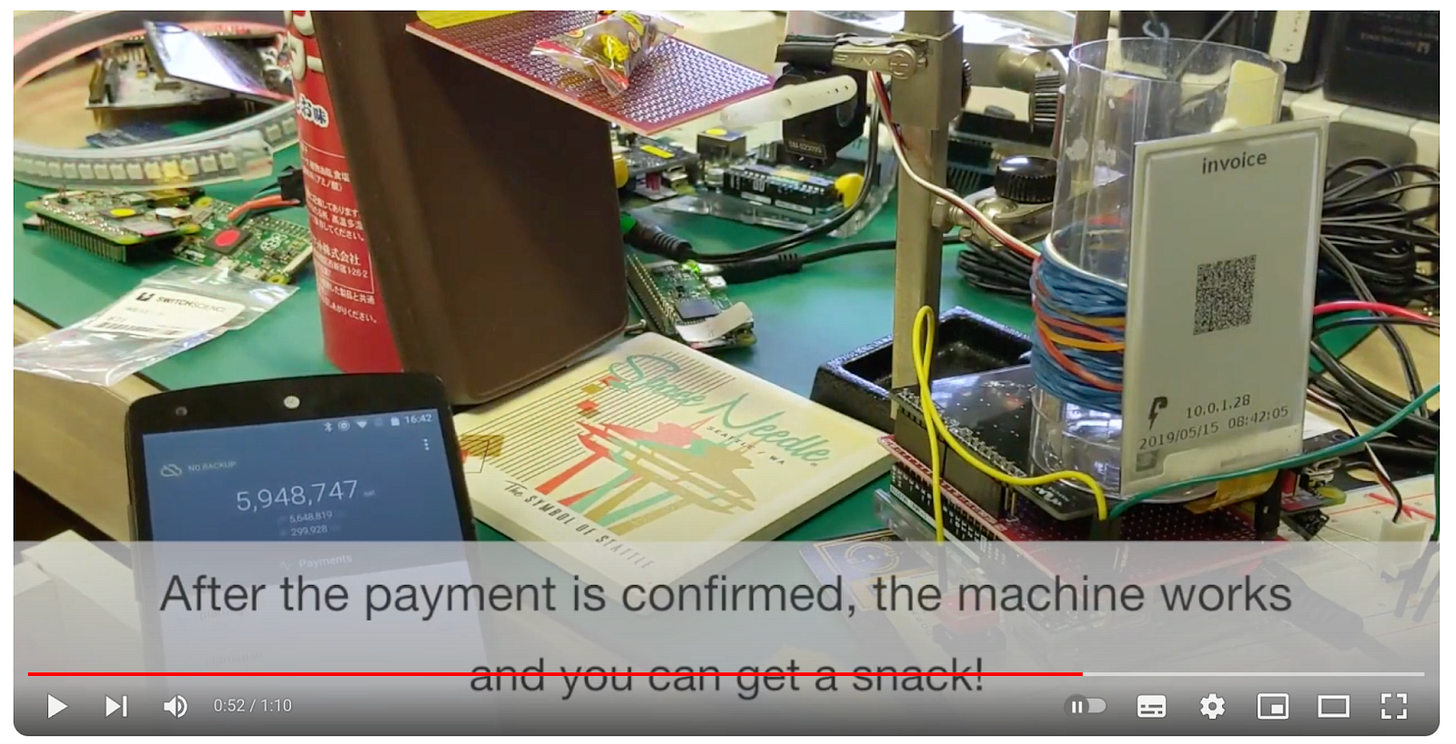(画像出所:NayutaのYouTubeより:”Lightning Network payment using Lightning Shield for Arduino works a vending machine”(動画:1分10秒)