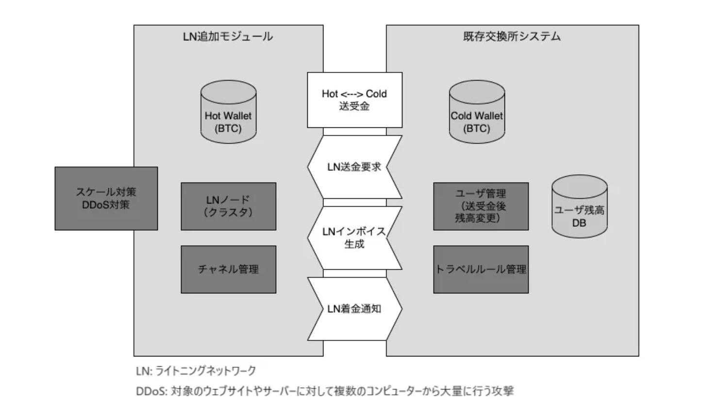 そこで、本事業では、下図のように、弊社で開発するライトニング追加モジュールを用い、企業様の既存カストディアルシステムへの組み込みを行うことで、その負担を減らすことが意図されています。