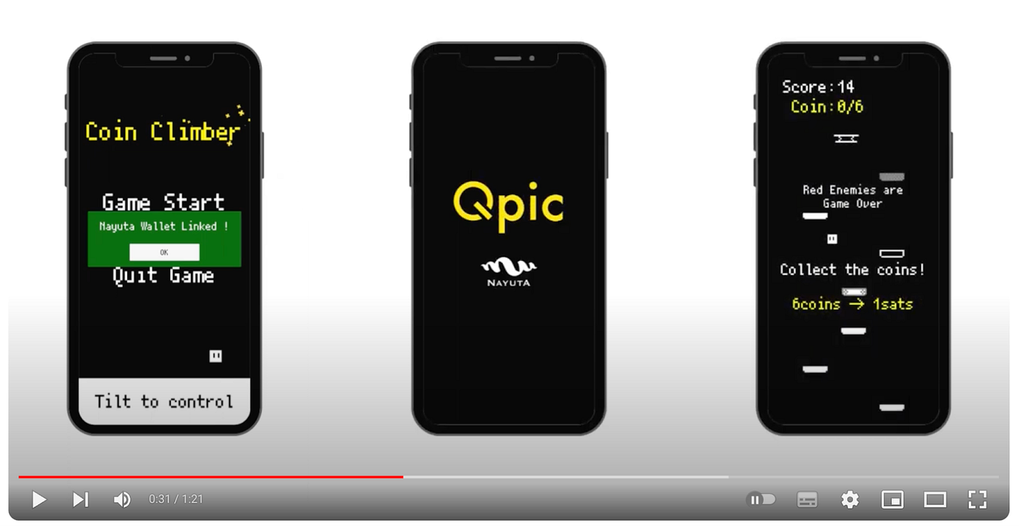(画像出所:NayutaのYouTubeより:九州大学物理研究部Qpicと共同で少額のBitcoinを獲得できるゲームCoin Climberを作成(動画:1分21秒))