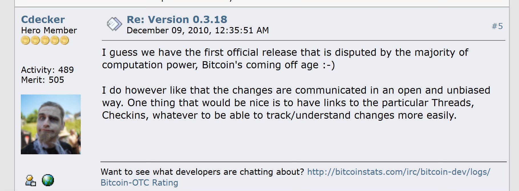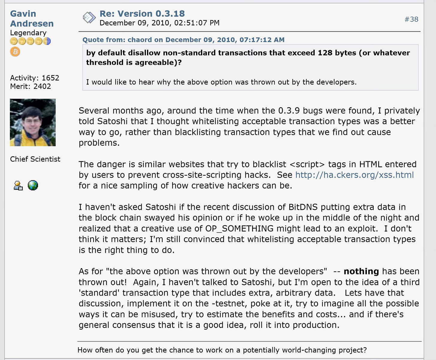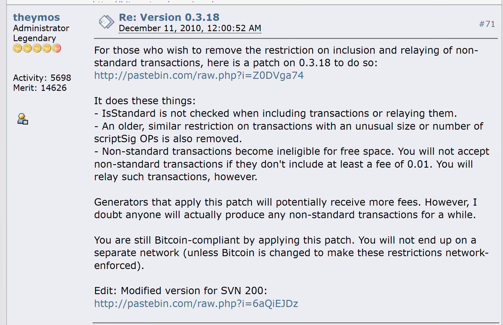 2010年12月8日、サトシは Bitcoin バージョン 0.3.18 をリリースしました。そこには「既知のトランザクションタイプのみを含める」という標準性チェックが導入されていました。