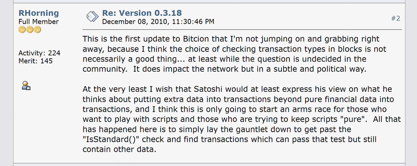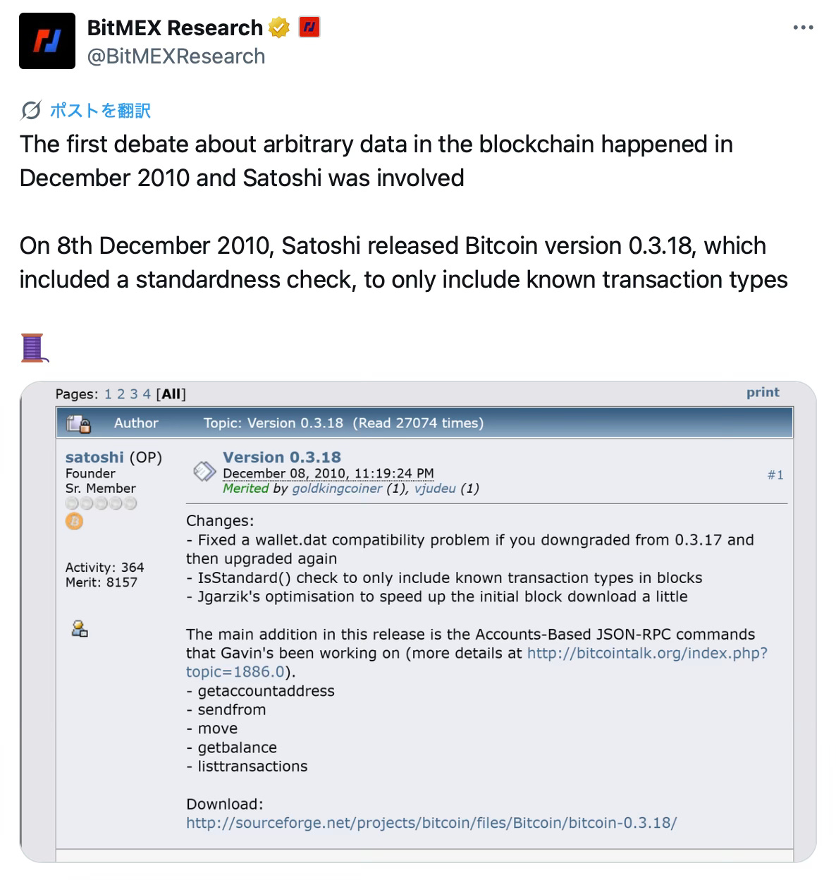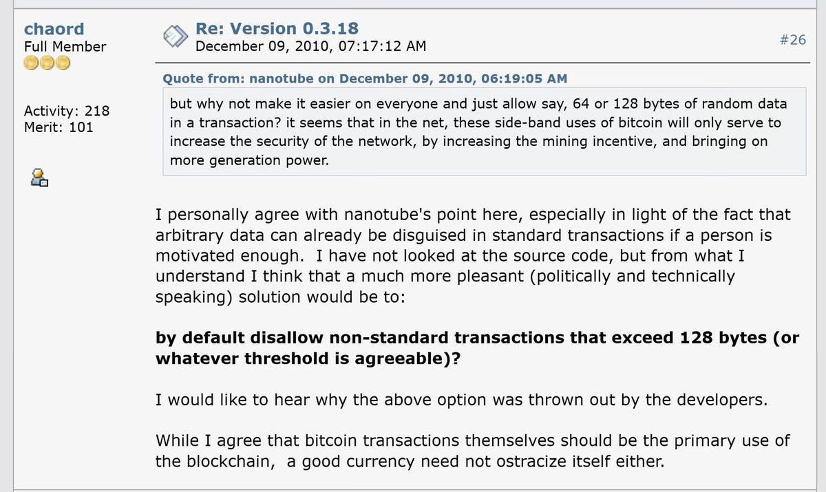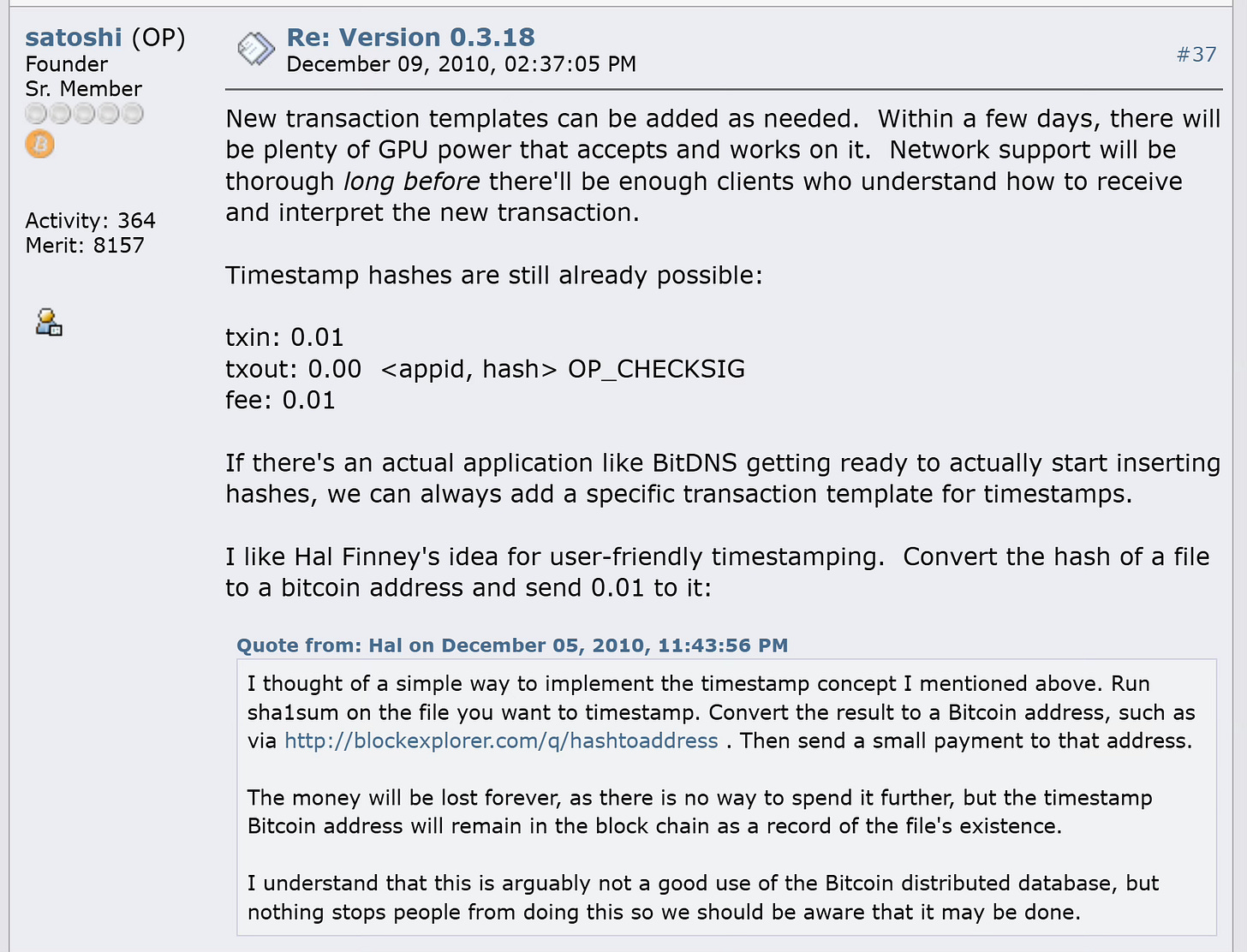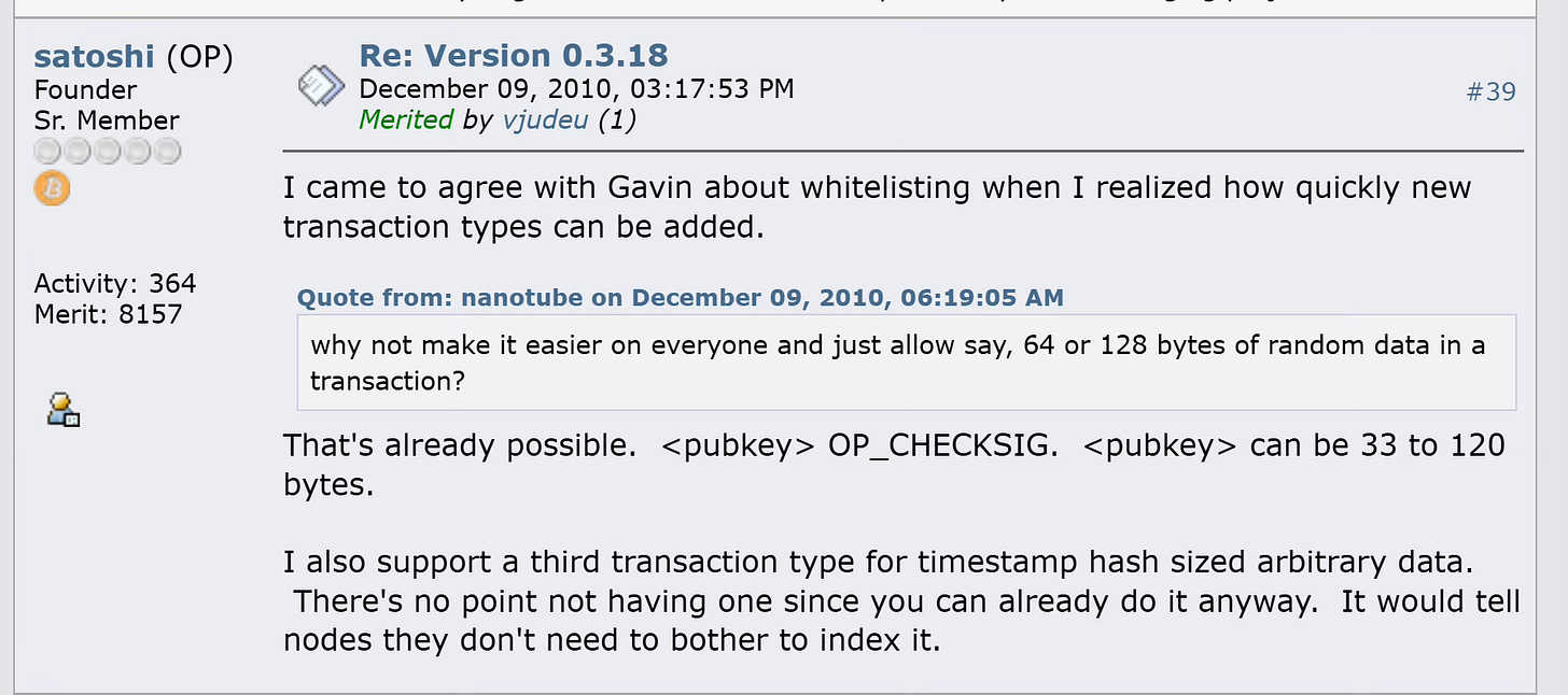 ブロックチェーンにおける任意データをめぐる最初の議論は2010年12月に起き、そこにサトシも関与していました。