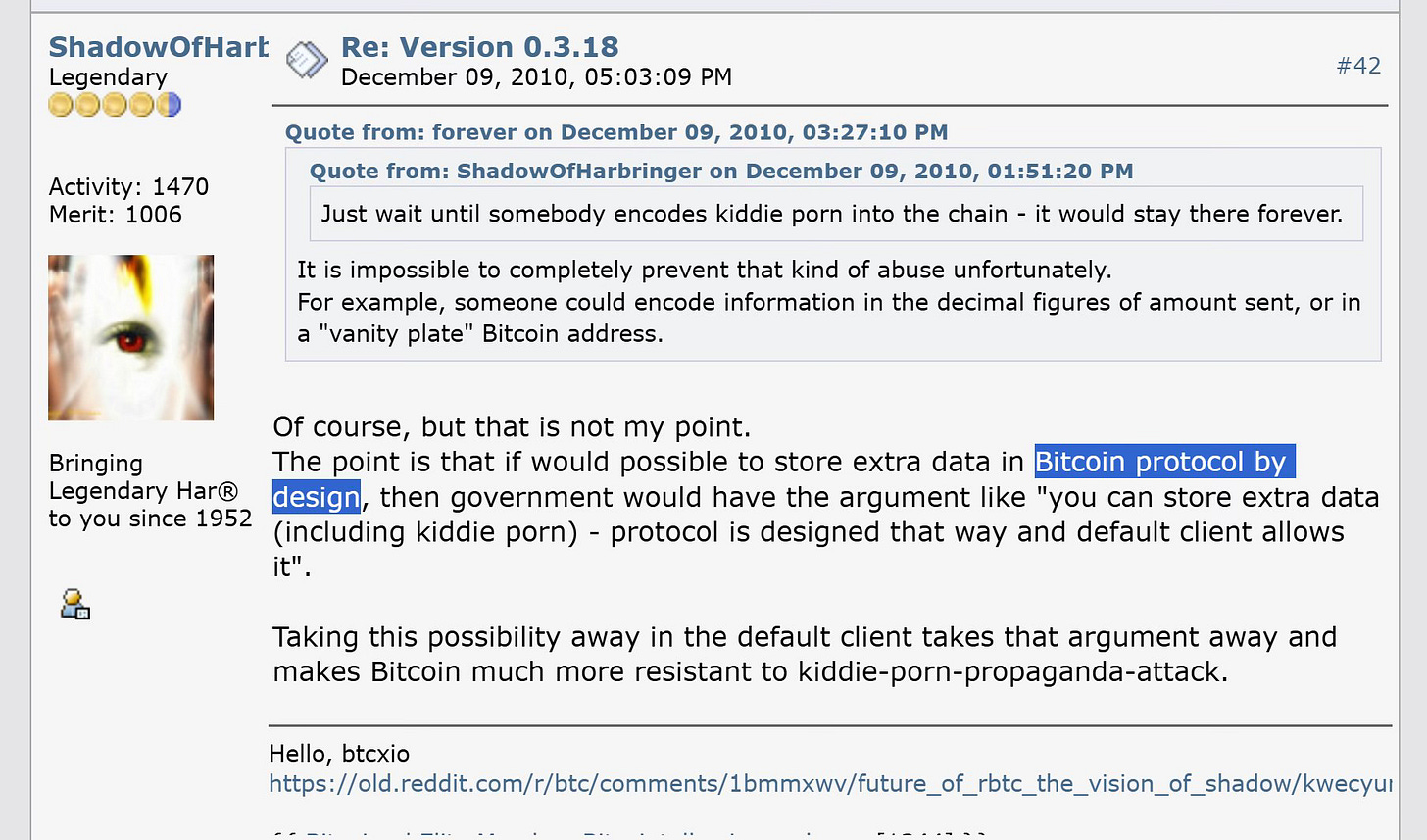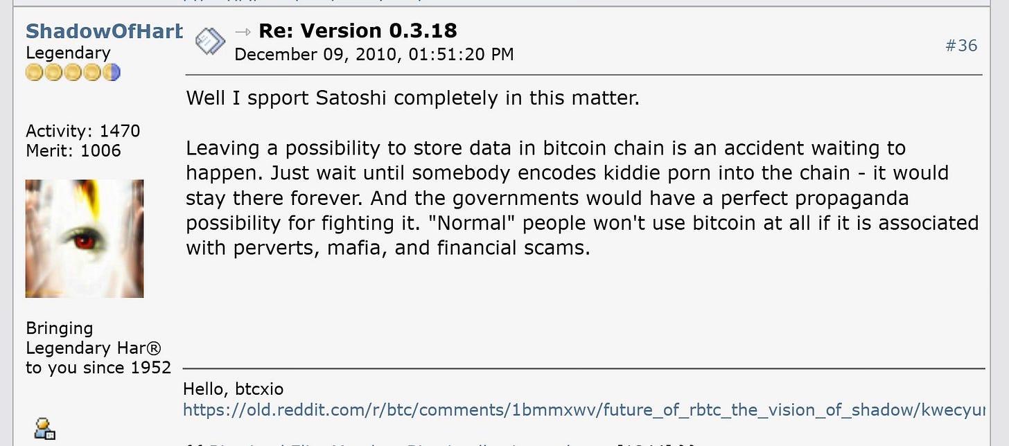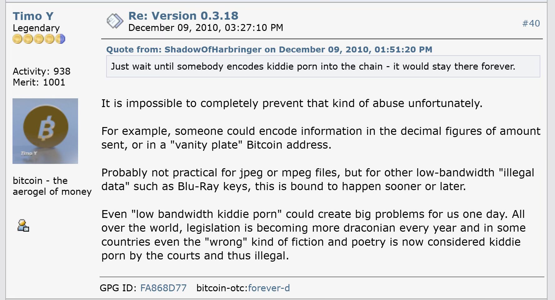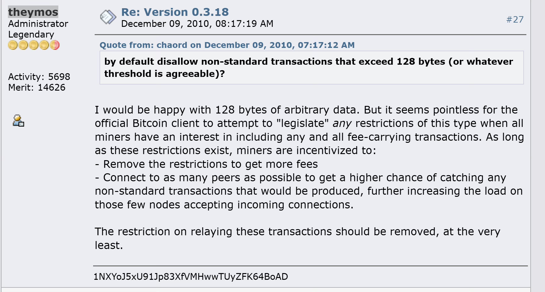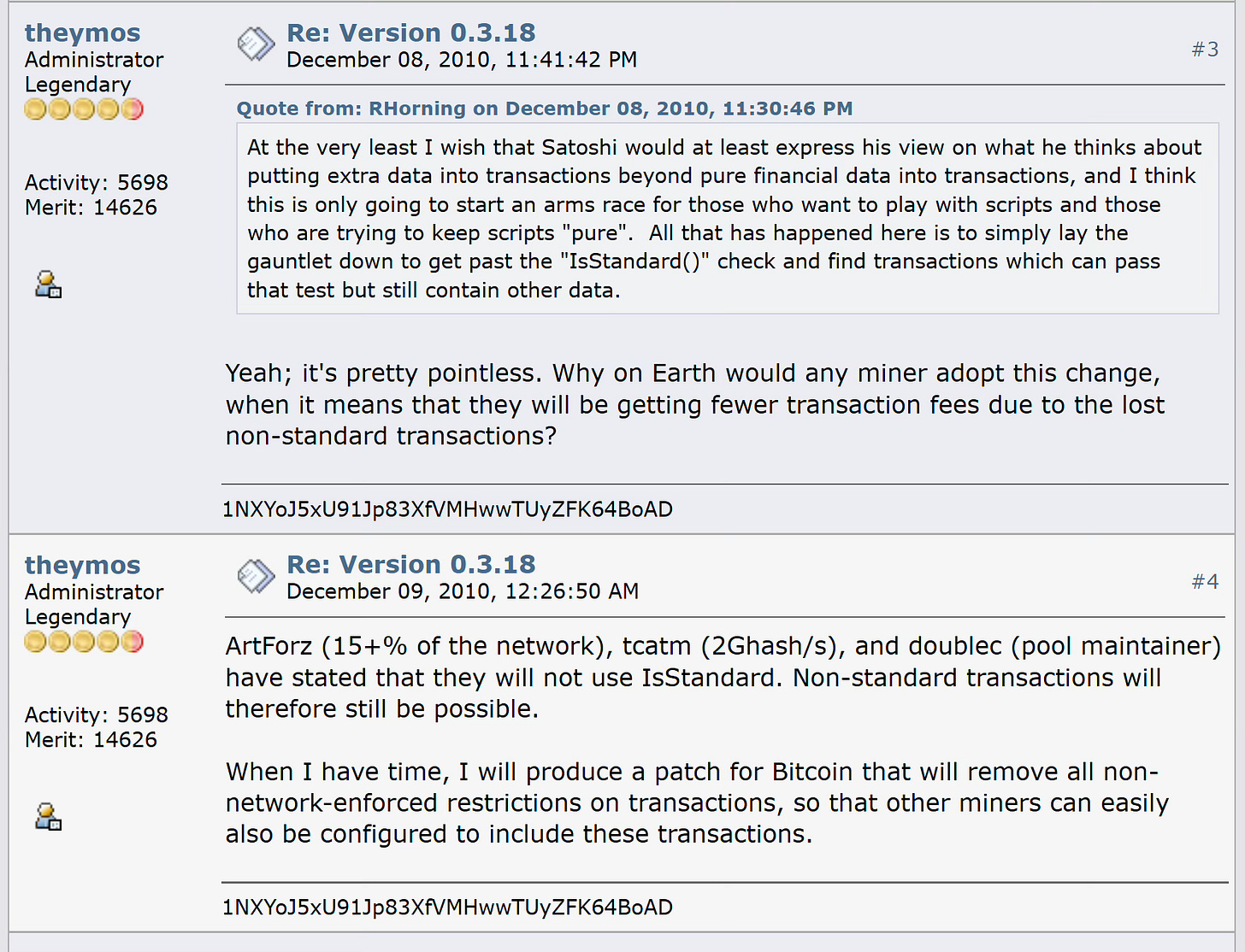 ブロックチェーンにおける任意データをめぐる最初の議論は2010年12月に起き、そこにサトシも関与していました。