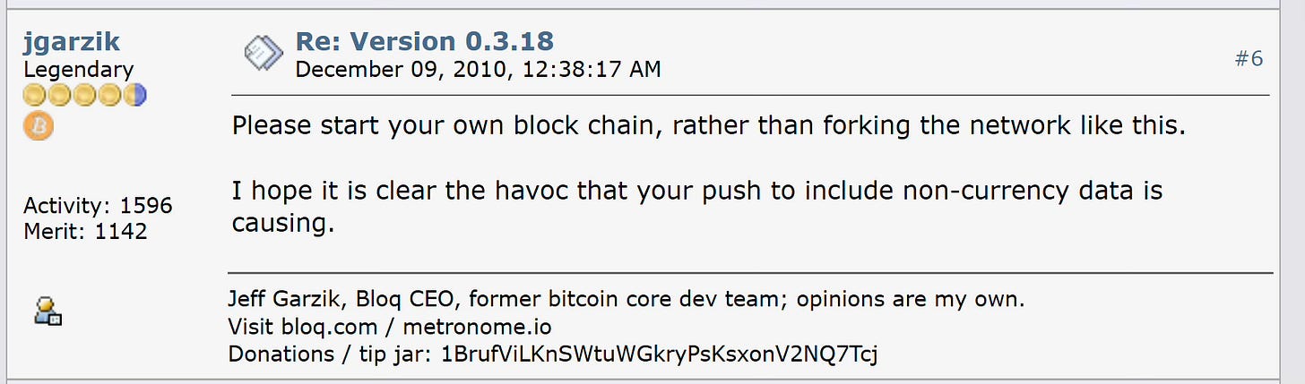@jgarzik は、サトシに文句を言った人々に不満を示し、「通貨以外のデータ」をブロックチェーンに含めるくらいなら自分のチェーンを立ち上げるべきだ、と発言しました。