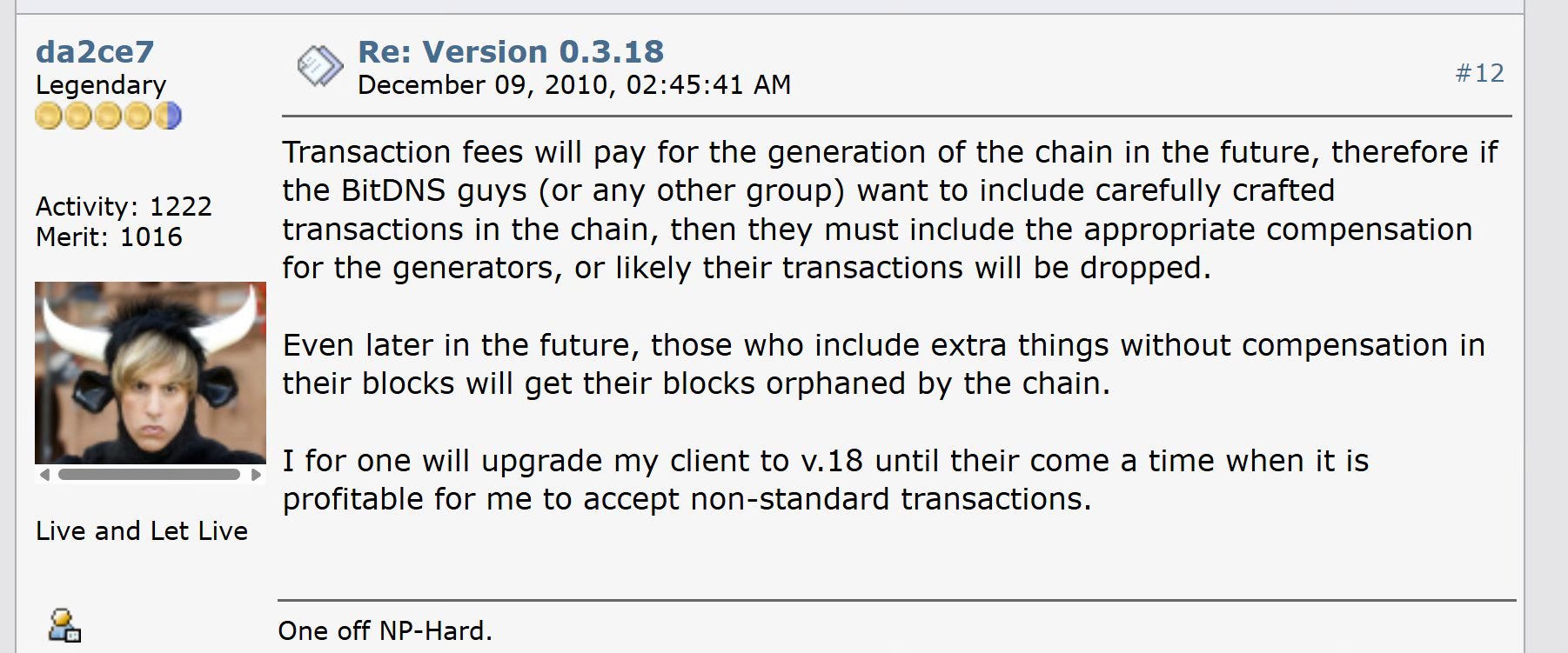 Da2ce7 は「すべては手数料の問題」であり、将来的には手数料がチェーン生成の原資となると述べました。非標準トランザクションも正しい手数料を払うなら問題ないと考えていたのです。