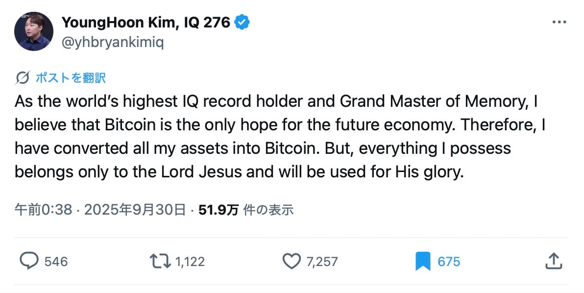 世界最高のIQ記録保持者であり、記憶のグランドマスターである私は、ビットコインこそが未来の経済にとって唯一の希望だと信じています。だからこそ、私はすべての資産をビットコインに換えました。けれども、私が持つものはすべて主イエスに属しており、その栄光のために用いられるのです。