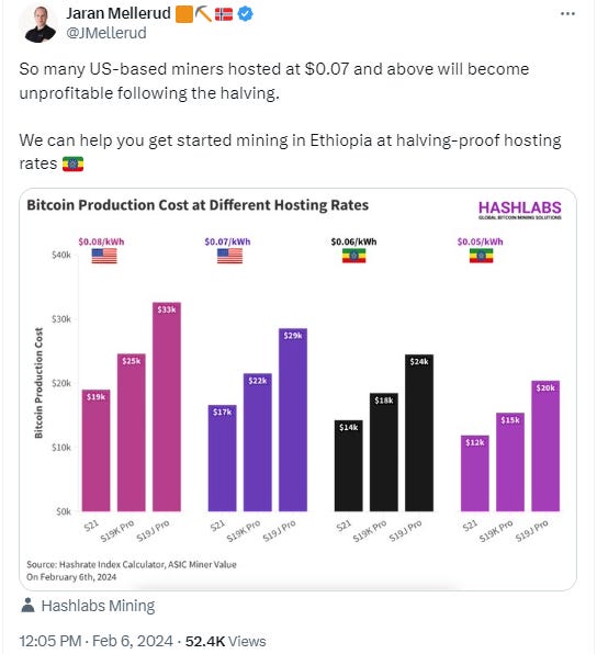 Hashlabs Mining は、米国とアフリカ・エチオピアでマイニングを行った場合を比較し、kWhあたり3セント違うだけ、1ビットコイン採掘費用に7,000~13,000ドルの差が出ると試算しています。エチオピアは、世界で最も低い電気料金を誇っています。
