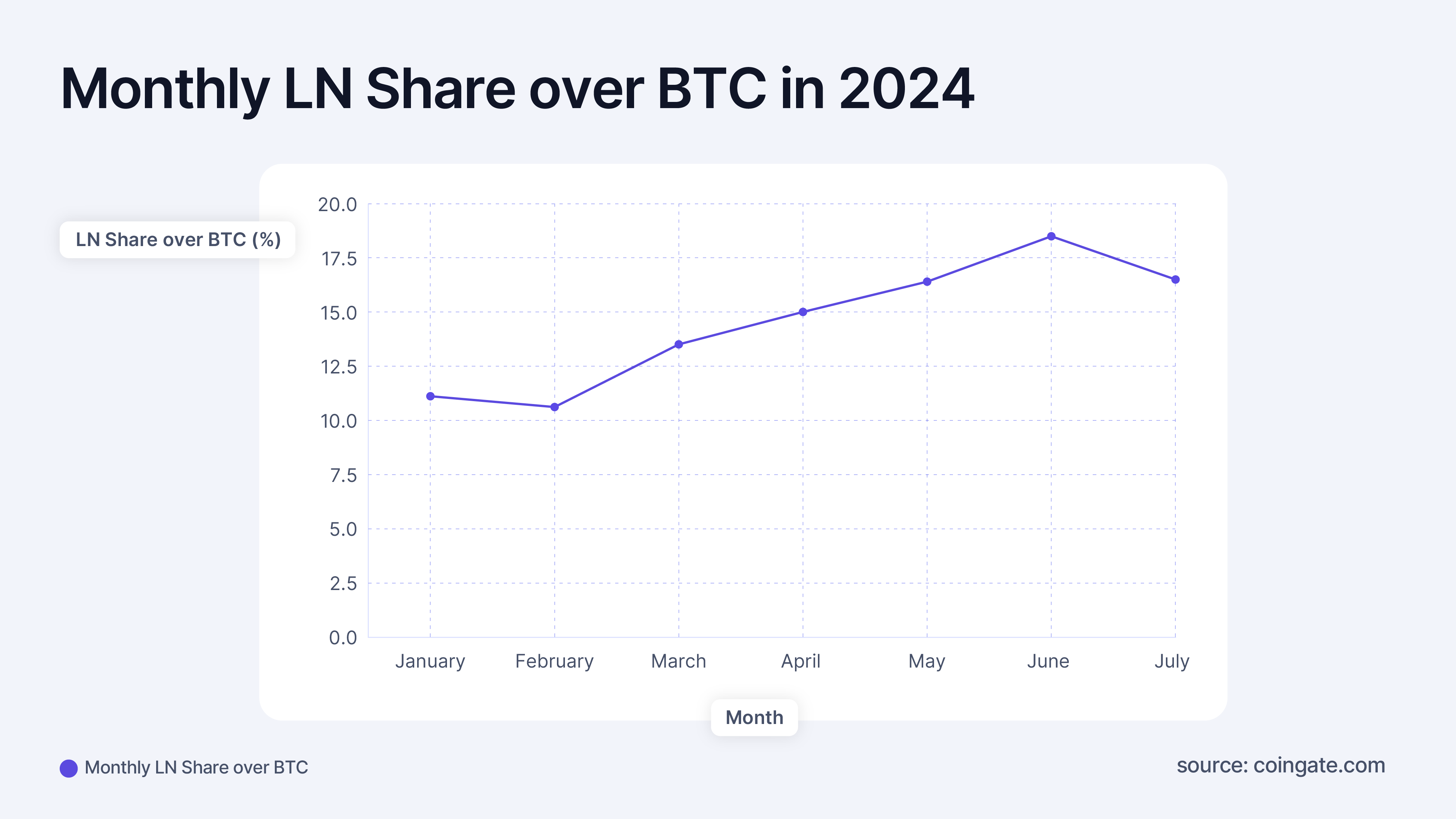 2024 年上半期は、さらに顕著な成長軌道が見られ、ライトニング経由の支払いシェアは4か月連続で増加しました。現在の成長率が継続すれば、LNの採用率は 2024 年第3四半期に20%以上に達する可能性があると予測されています。